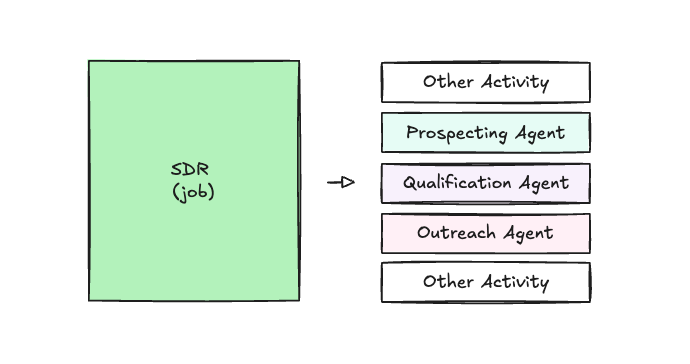 Now imagine unbundling across actual employee work. Take SDRs: their job spans prospecting, outreach, and qualification (among other activities). Individual agents might handle one or multiple of these discrete activities end-to-end - see Alice from 11x.