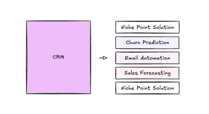 Let’s look at an example. We've seen the CRM being unbundled from the ERP and after the creation of point solutions for email automation, revenue forecasting, and more. This created complex, stitched-together GTM landscapes (euphemistically, the best-of-breed stack).