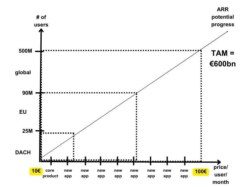A chart I increasingly see in pitch decks - popularized by Personio - shows TAM as a function of app bundling and market expansion (usually geo, vertical, or size). Reaching $500M+ ARR looks more achievable.