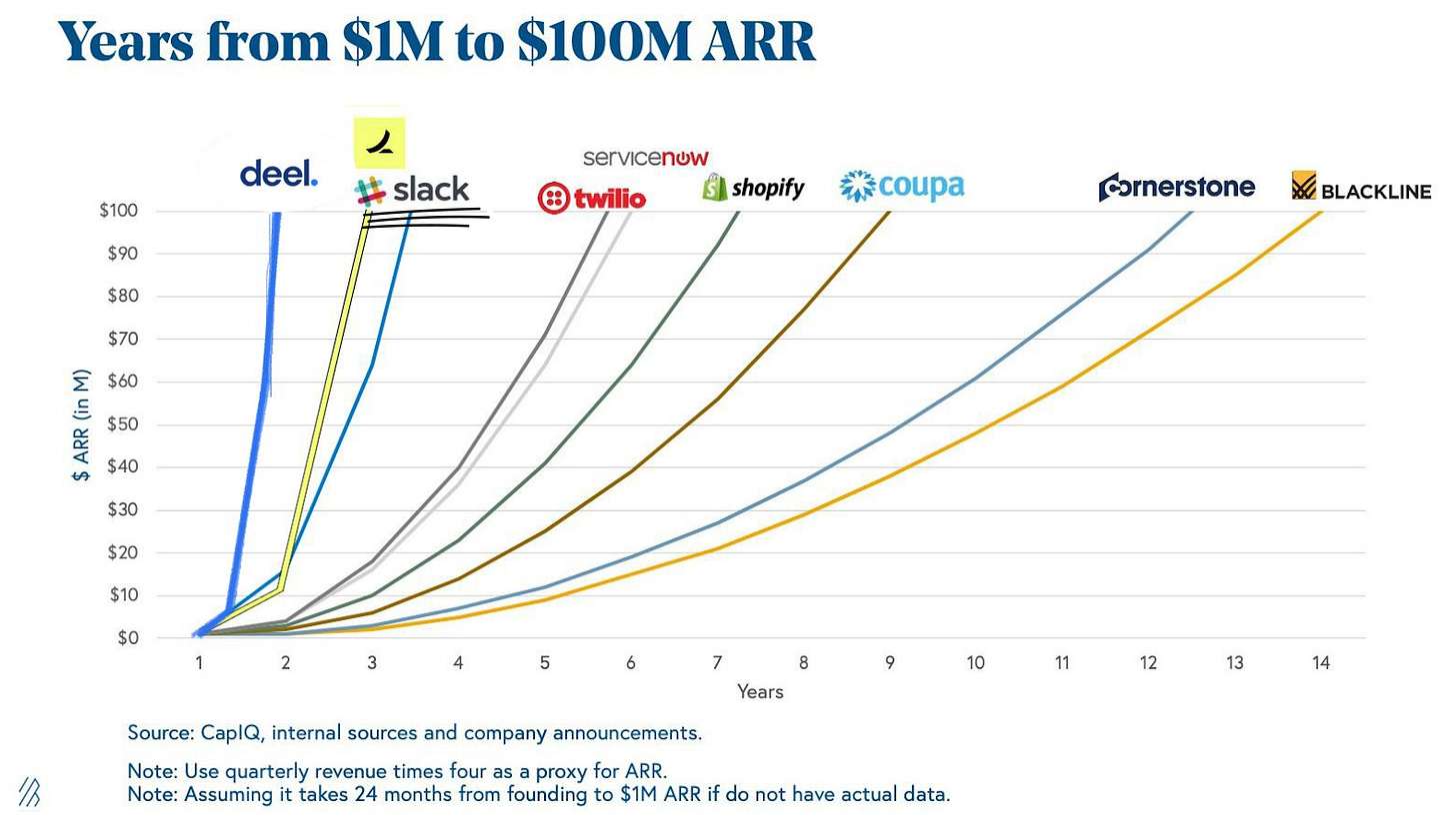 Despite not being the first in its category (Hipchat had been around since 2010), Slack quickly gained traction, with 8,000 signups on its first day and 15,000 by the second week. Slack’s growth was rapid, reaching $100 million in ARR faster than almost any other company. Its success was driven by a bottom-up distribution model that appealed to both startups and large enterprises—by the time of its IPO, about two-thirds of the Fortune 100 were using Slack.