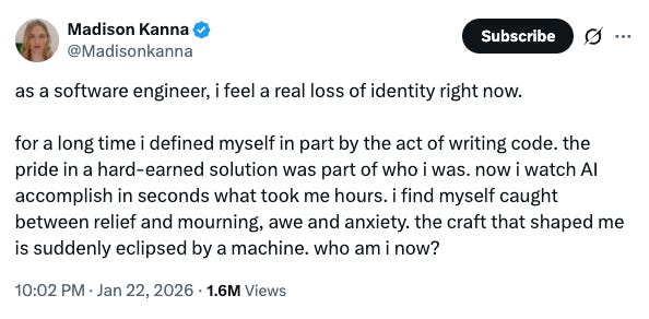 For engineers that spent thousands of hours learning to write code, watching a machine do in minutes what took them hours isn’t an efficiency win. They’re losing an identity they built over years. A skill they staked their career on is being commoditized.
