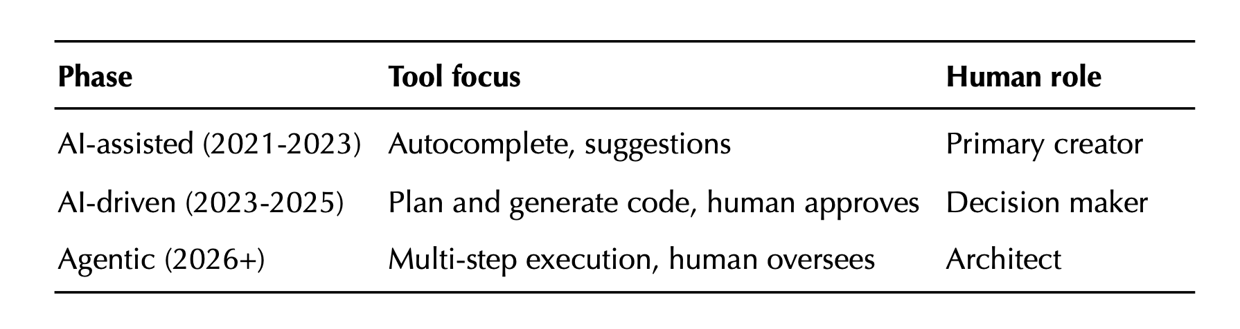 Despite the gap between the pace of codegen advancements and expectations within the software community, software engineering is going from human-written to fully autonomous at remarkable speed. In five years, we went from AI-assisted to AI-written.