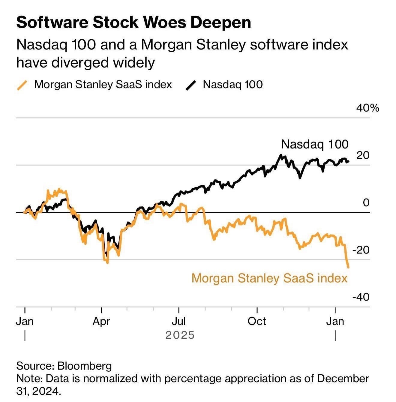 Public SaaS multiples compressed from 12x to 5x in twelve months. Since ChatGPT’s launch, Nasdaq 100 is up over 100%. Software? Up 19%. But the pressure isn’t uniform. The spread between top and bottom decile multiples has blown out to 16x, versus a historical norm of 3-4x.