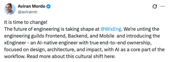 "Wix just merged all engineering titles into “xEngineer.” With AI handling the mechanical work, the focus shifts to people who can own end-to-end - not only in engineering, but across the whole product org." > Interesting, we are seeing the reverse. Since most of the job is shifting to planning and reviewing, specialisation leads to more efficiency in our case.