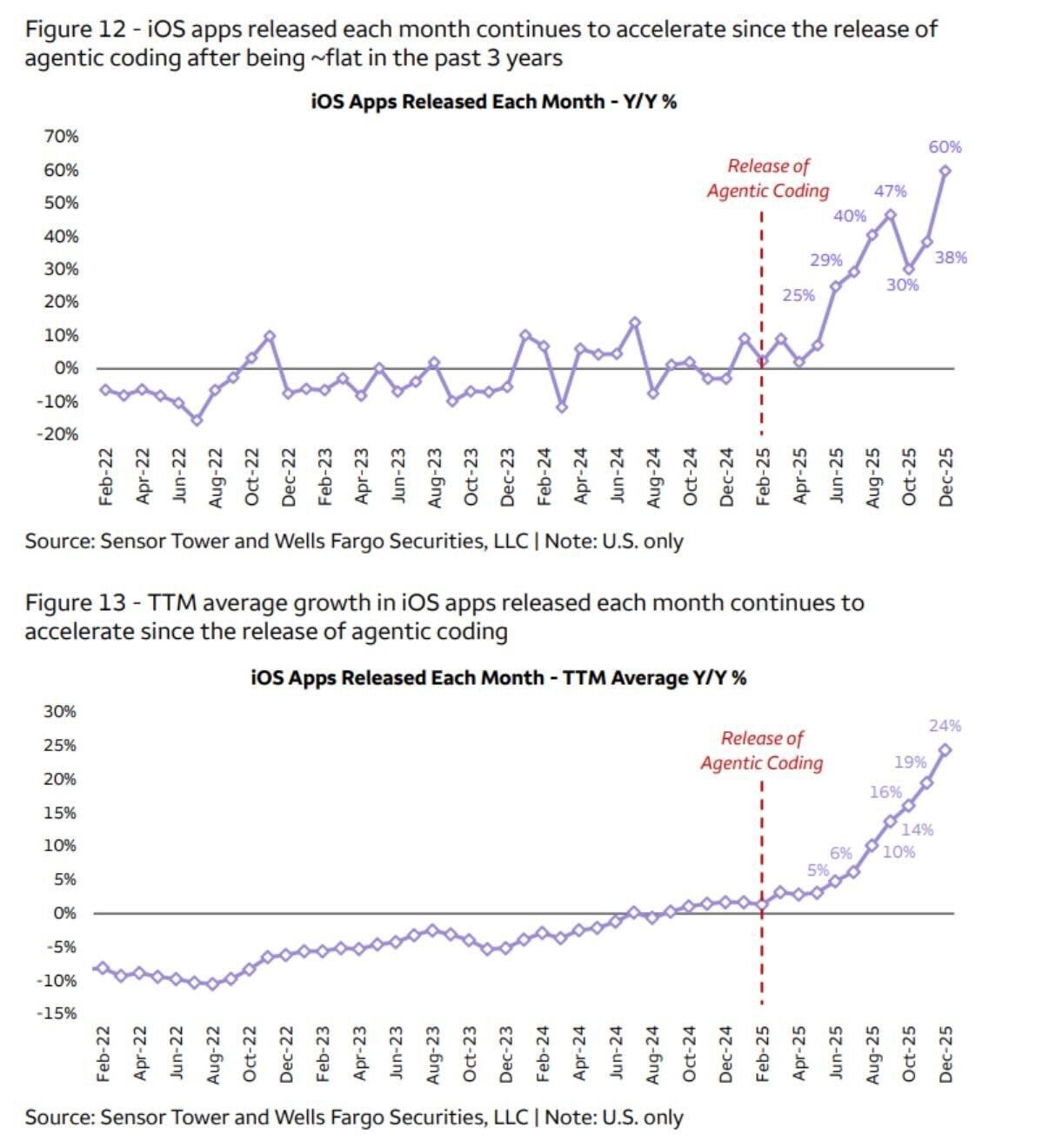 Take iOS app releases. They held steady from 2022 to 2024. Starting February 2025, the numbers climbed - accelerating to 60% year-over-year growth by December, coinciding with Opus 4.5.